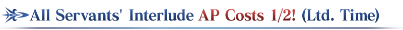 Interludes for all Servants will have their AP costs halved for a limited time during the period below! (AP costs will be halved even if you withdraw from battle) * "Spirit Origin Release Quests" will not be eligible for this campaign. Don't miss this chance to fulfill the unlock requirements and clear your favorite Servants' Interludes!