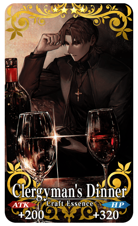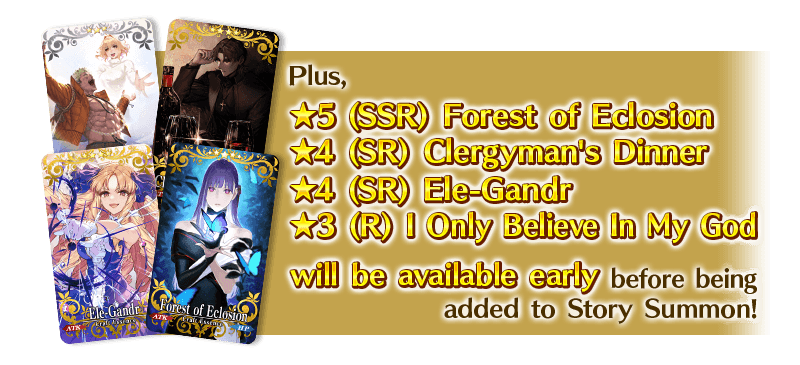 ▼Early Release Permanent Craft Essences - ★5 (SSR) Forest of Eclosion - ★4 (SR) Clergyman's Dinner - ★4 (SR) Ele-Gandr - ★3 (R) I Only Believe In My God