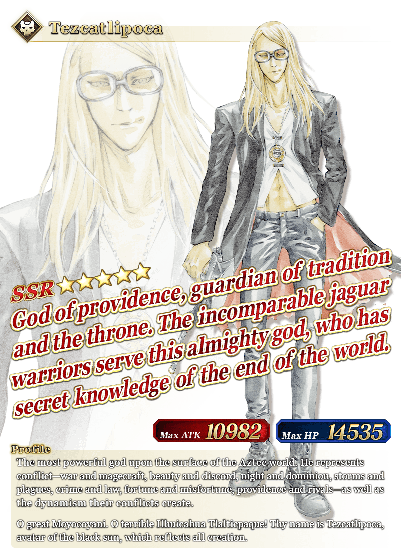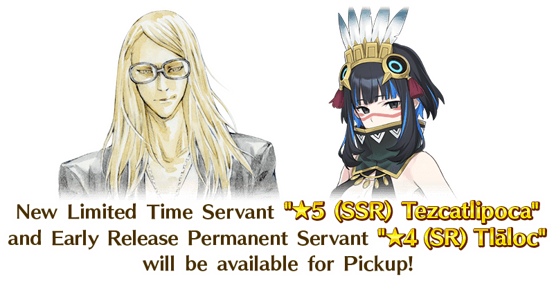 About Featured Servants: * The following Servant(s) will not be added to Story Summon after the Pickup Summon period ends. - ★5 (SSR) Tezcatlipoca * The following Servant(s) will be added to Story Summon after the Pickup Summon ends. - ★4 (SR) Tlāloc * Servants added to Story Summon through story progression will not be summonable. Please be sure to confirm the lineup before summoning.