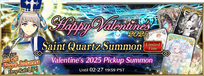 About ★5 (SSR) Pope Johanna: * In order to give ★5 (SSR) Pope Johanna Blessed Lock-On Chocolate (Strawberry), you will need to clear Main Quest Section 7 of the Limited Time Event "Johanna and the Unidentified Love: Smash 'em Up☆Love, Lovers, and the Great Stone Statue". Accordingly, receiving her Valentine's gift (Craft Essence) and granting the Special Skill using Blessed Lock-On Chocolate (Strawberry) will only become possible starting 2025-02-11 20:00 PST (GMT -8).