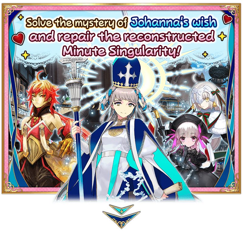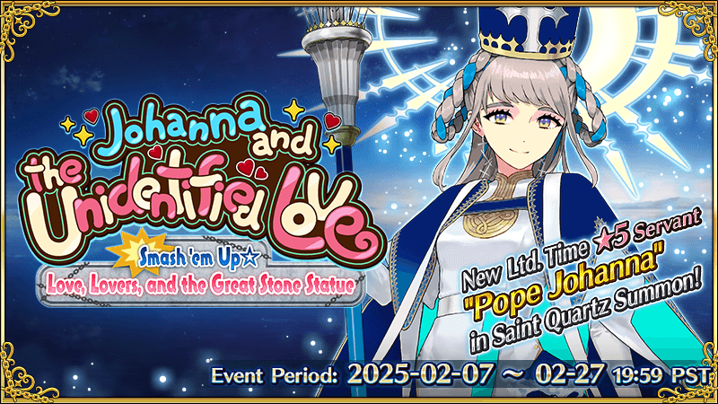 About ★5 (SSR) Pope Johanna: * In order to give ★5 (SSR) Pope Johanna Blessed Lock-On Chocolate (Strawberry), you will need to clear Main Quest Section 7 of the Limited Time Event "Johanna and the Unidentified Love: Smash 'em Up☆Love, Lovers, and the Great Stone Statue". Accordingly, receiving her Valentine's gift (Craft Essence) and granting the Special Skill using Blessed Lock-On Chocolate (Strawberry) will only become possible starting 2025-02-11 20:00 PST (GMT -8).