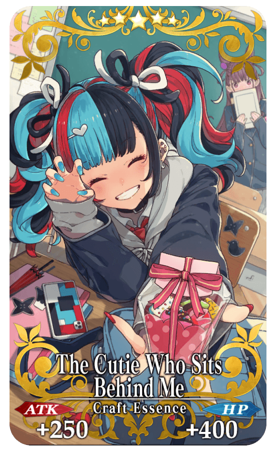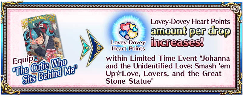 Increase the amount of Lovey-Dovey Heart Points per drop by equipping the Event Limited Craft Essence "★5 (SSR) The Cutie Who Sits Behind Me", available through Event Item Exchange.
