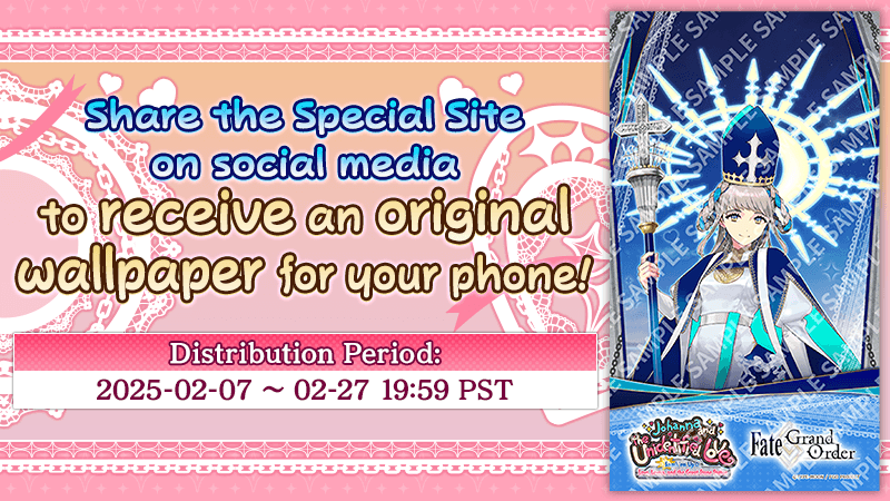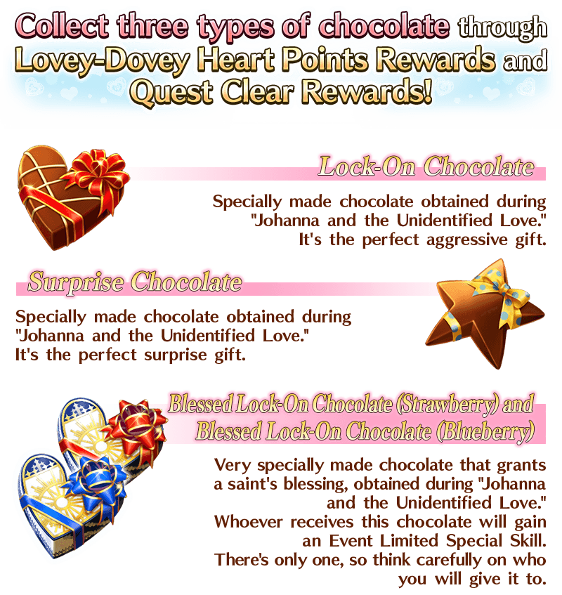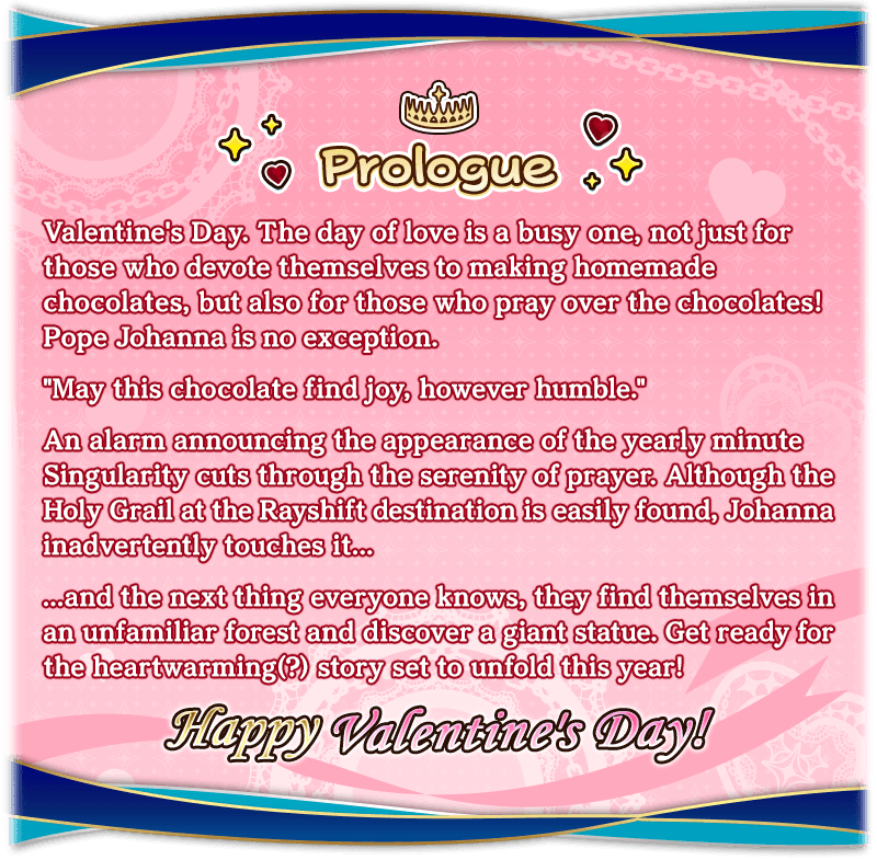 About Receiving ★5 (SSR) Pope Johanna's Valentine's Gift (Craft Essence): * In order to give ★5 (SSR) Pope Johanna Lock-On Chocolate, Surprise Chocolate, or Blessed Lock-On Chocolate (Strawberry), you will need to clear Main Quest Section 7 of the Limited Time Event "Johanna and the Unidentified Love: Smash 'em Up☆Love, Lovers, and the Great Stone Statue". Accordingly, receiving her Valentine's gift (Craft Essence) and granting the Special Skill using Blessed Lock-On Chocolate (Strawberry) will only become possible starting 2025-02-11 20:00 PST (GMT -8).