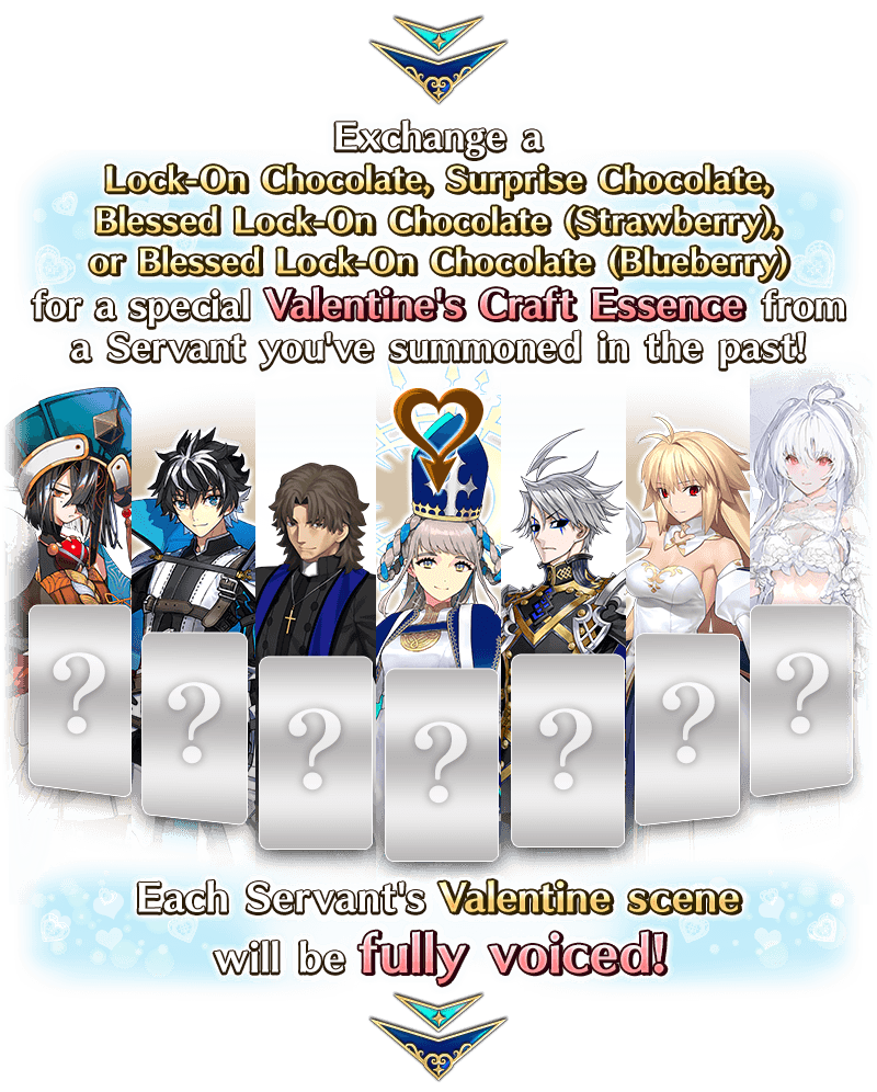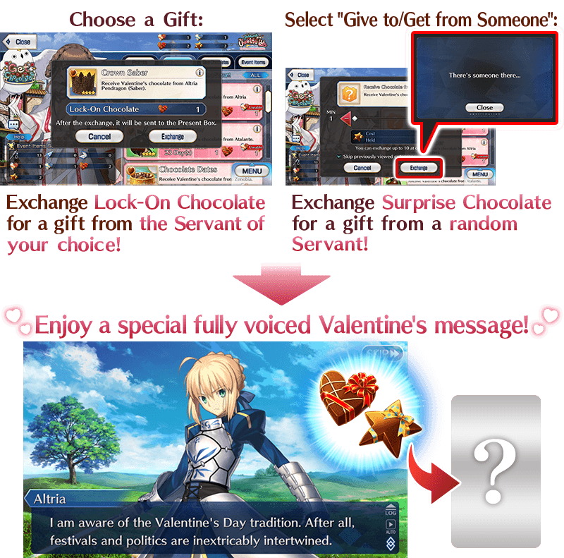 * The Valentine's gift cutscenes and Craft Essences will be the same whether you exchange Lock-On Chocolate or Surprise Chocolate. * You can make up to ten exchanges at one time in both "Give Chocolates" and "Get Chocolates".