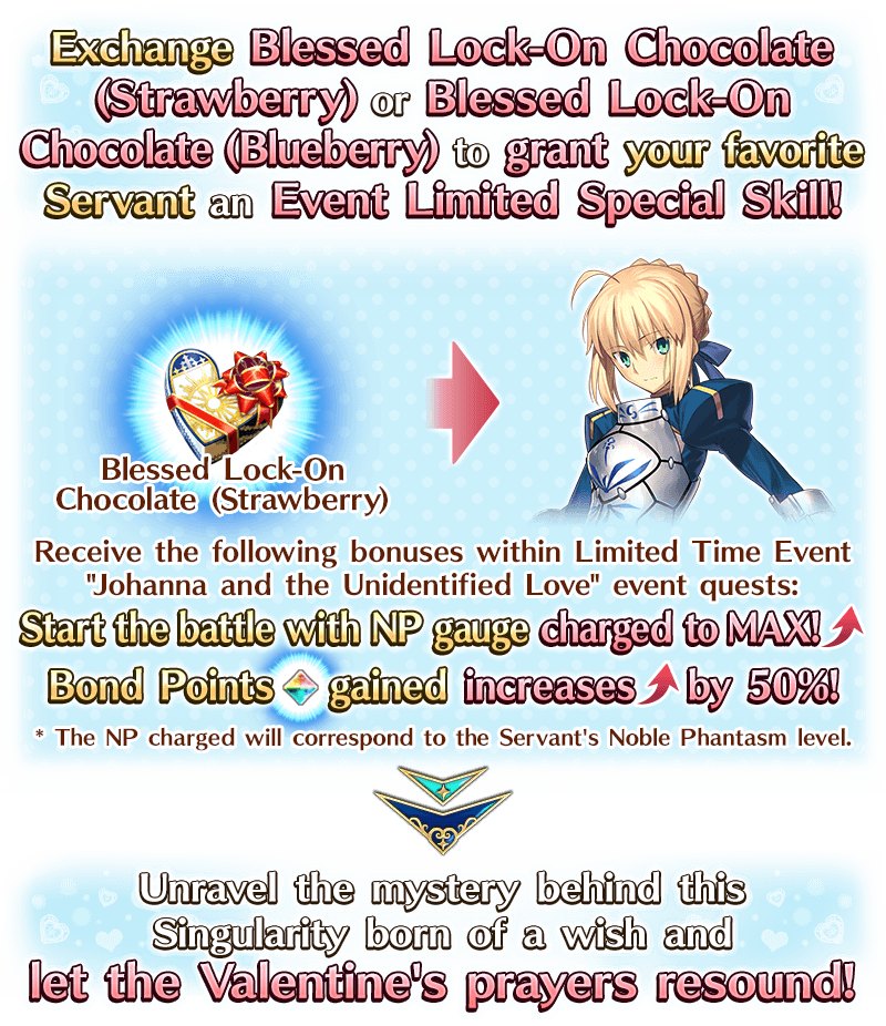 By exchanging Blessed Lock-On Chocolate (Strawberry) or Blessed Lock-On Chocolate (Blueberry) for a Valentine's gift (Craft Essence), an eligible Servant will gain the Event Limited Special Skill "Blessing of the Saint EX" for the duration of this event.