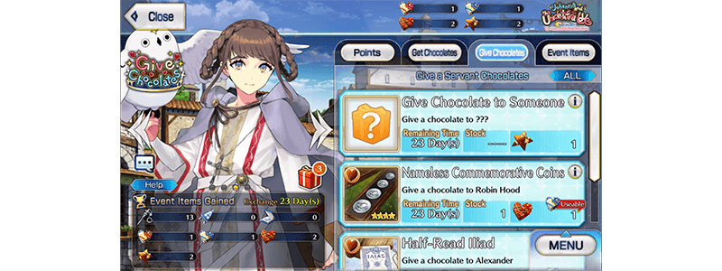 Receive Valentine's gifts (Craft Essences) from female Servants through "Get Chocolates" and male Servants through "Give Chocolates" within Event Item Exchange.
