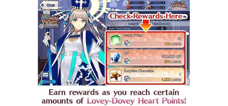 Receive rewards as your Lovey-Dovey Heart Points total reaches certain levels.