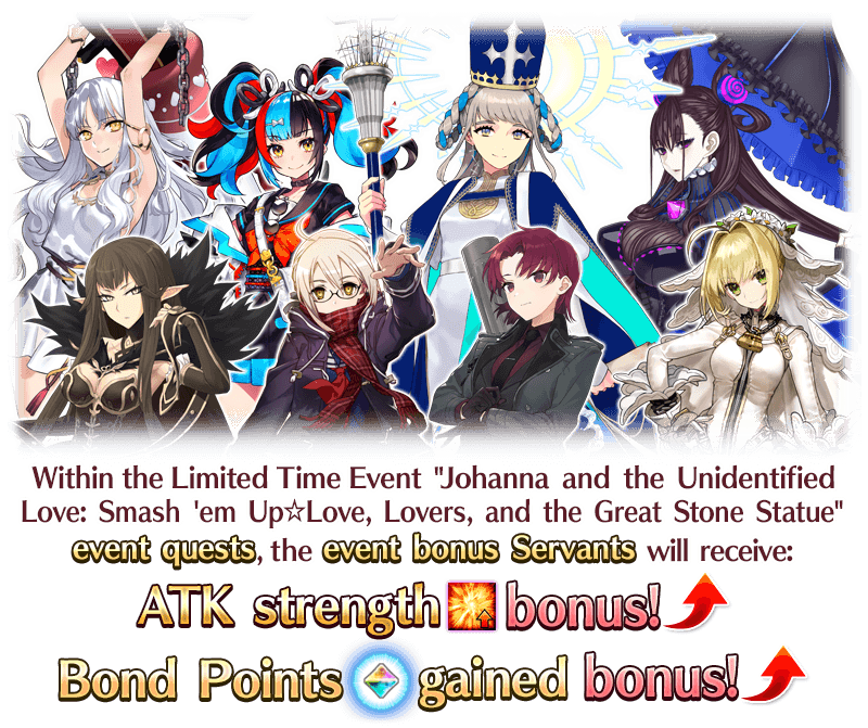 During the event, the Servants listed below will receive an ATK strength bonus and a Bond Points gained bonus within event quests!