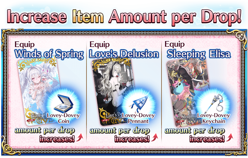 When you equip the Limited Time Craft Essences "★5 (SSR) Winds of Spring", "★4 (SR) Love's Delusion", and "★3 (R) Sleeping Elisa", available through the Pickup Summons ongoing during the event, you will gain a bonus to the amount per drop of event items "Lovey-Dovey Coin", "Lovey-Dovey Pennant", and "Lovey-Dovey Keychain", respectively.