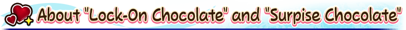 Acquire Lock-On Chocolate and Surprise Chocolate as Lovey-Dovey Heart Points Rewards. You can exchange these chocolates in the Event Item Exchange "Get Chocolates" and "Give Chocolates" for Valentine's gifts (Craft Essences).