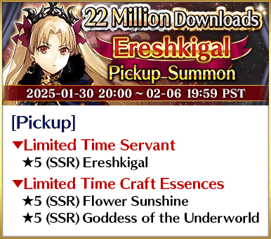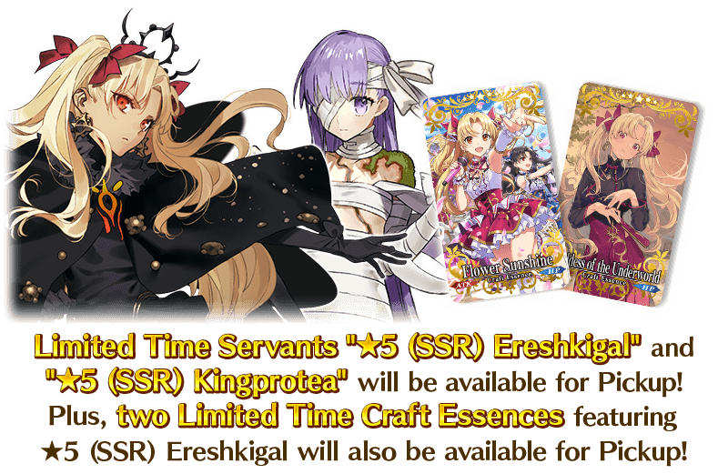 About Featured Servants: * The following Servant(s) will only be summonable from the Summon Lineup(s) where they are featured as Pickup Servant(s). Please be sure to confirm the lineup before summoning. - ★5 (SSR) Ereshkigal - ★5 (SSR) Kingprotea * The following Servant(s) will not be added to Story Summon after the Pickup Summon period ends. - ★5 (SSR) Ereshkigal - ★5 (SSR) Kingprotea * Servants added to Story Summon through story progression will not be summonable. Please be sure to confirm the lineup before summoning.