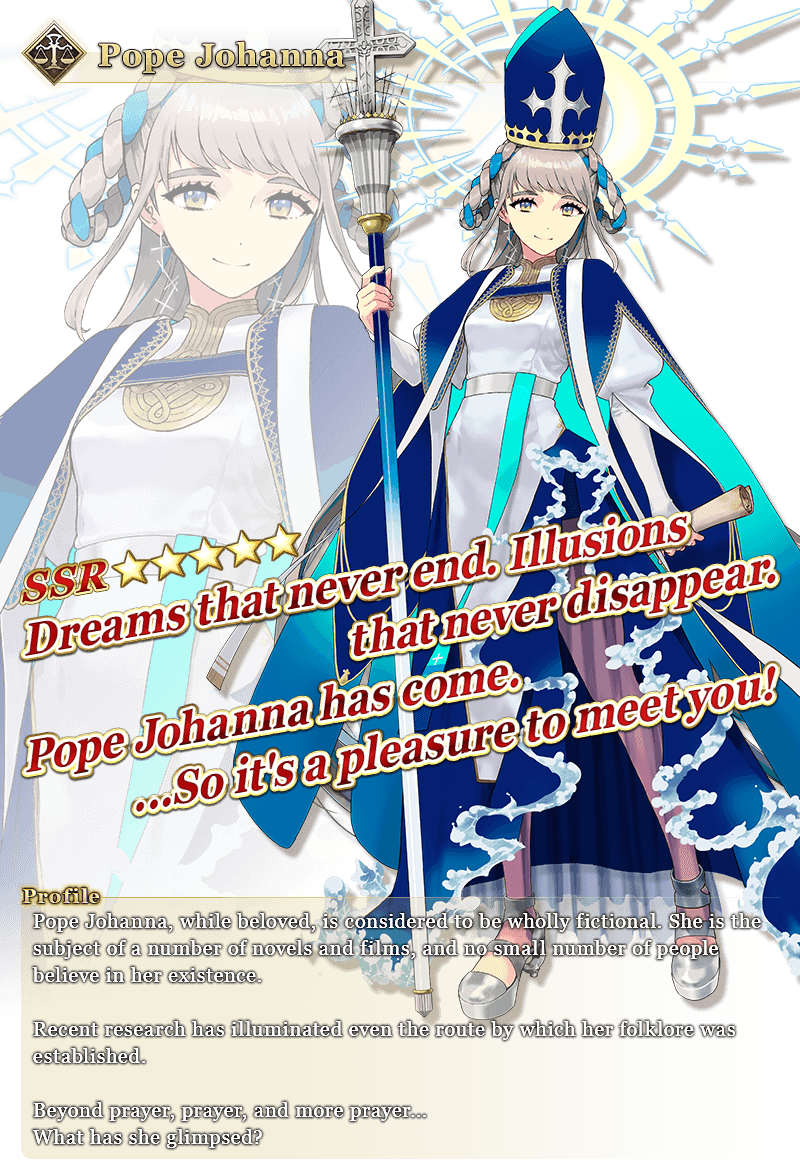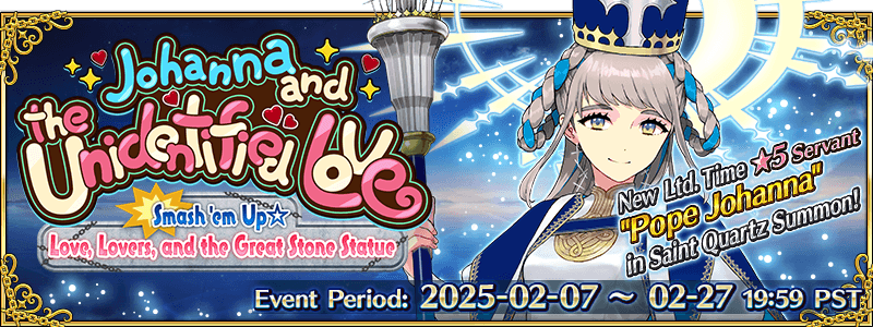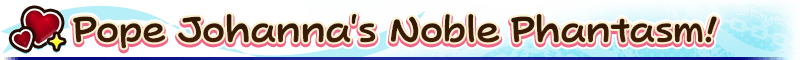 To commemorate the Limited Time Event "Johanna and the Unidentified Love: Smash 'em Up☆Love, Lovers, and the Great Stone Statue", the new Limited Time Servant "★5 (SSR) Pope Johanna" and three Limited Time Craft Essences will be available for Pickup!