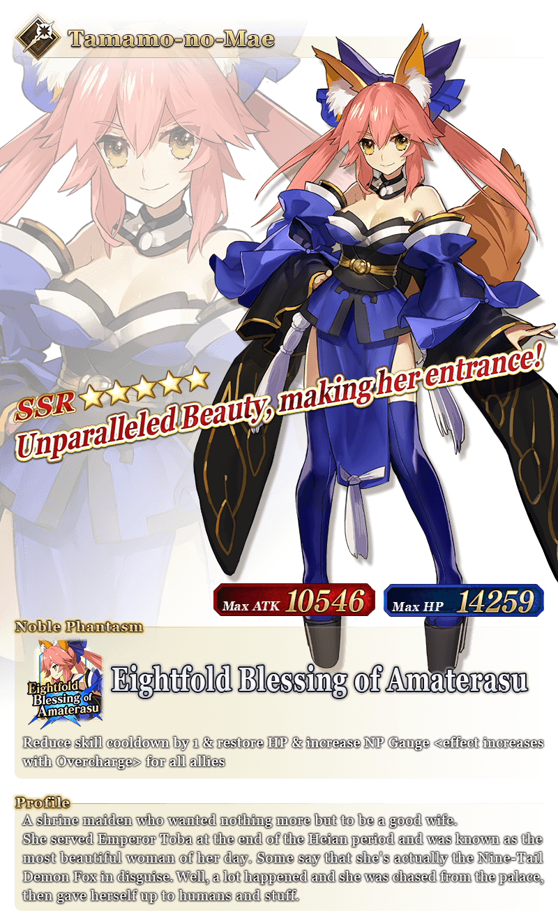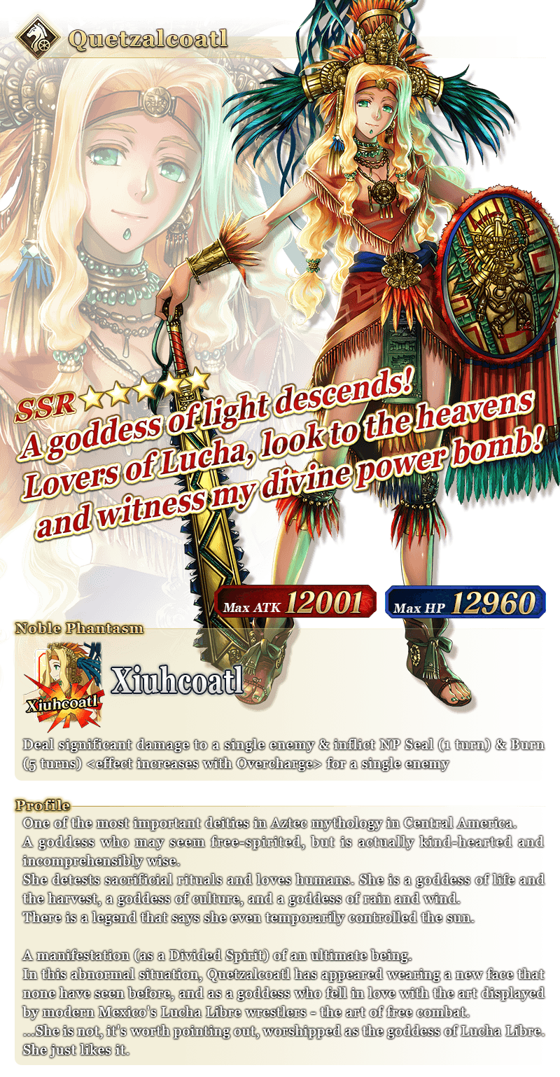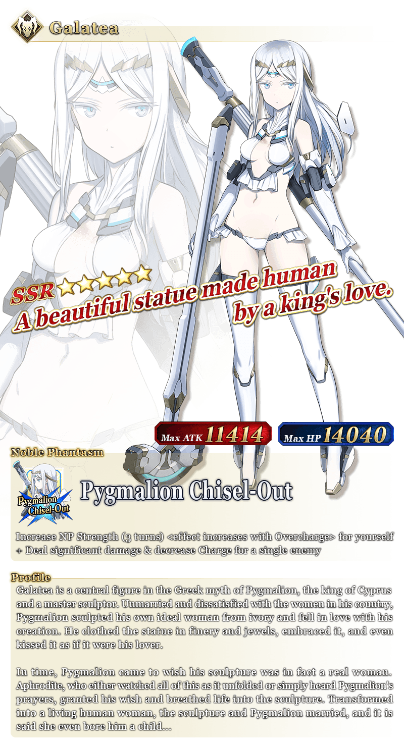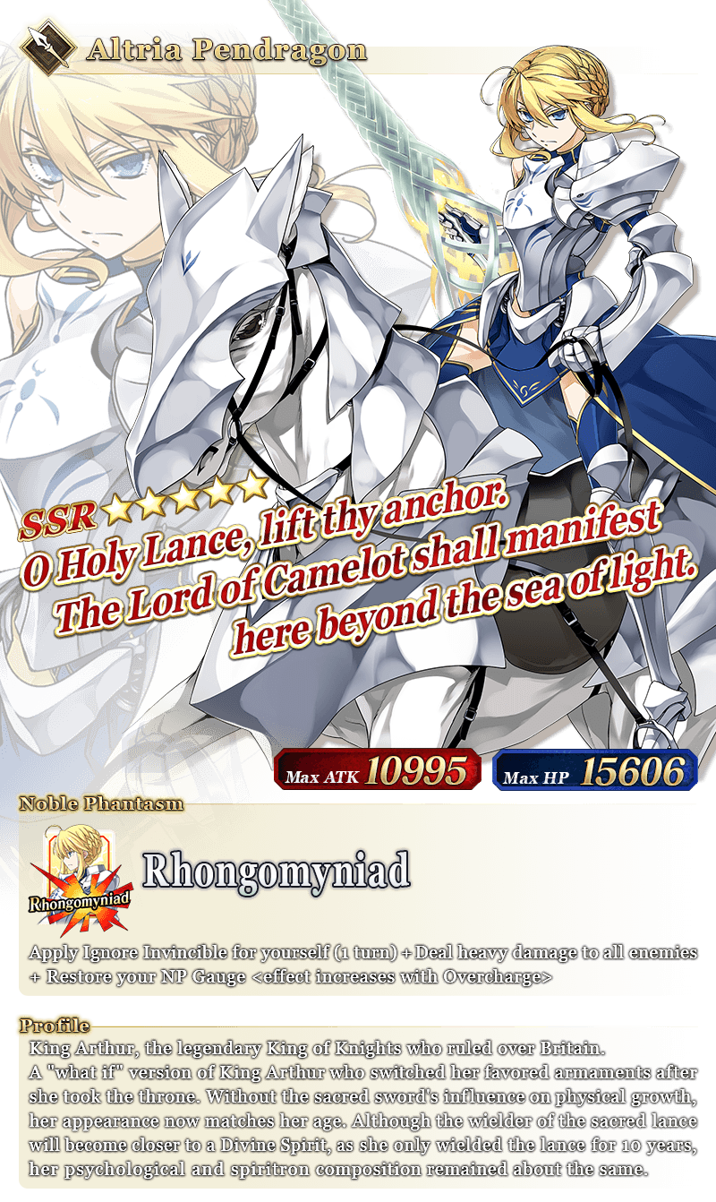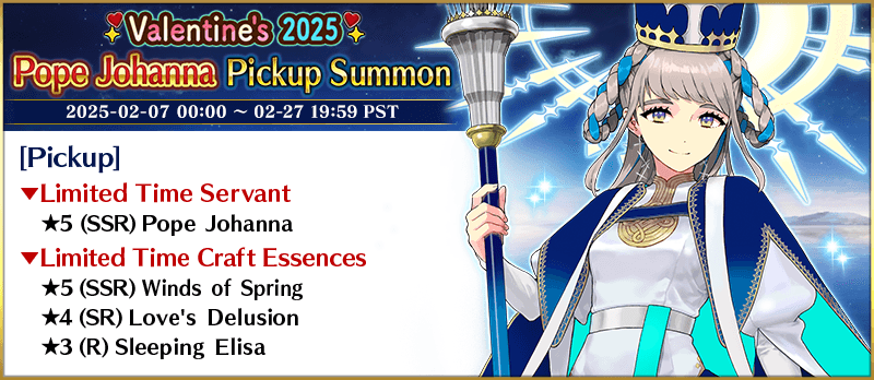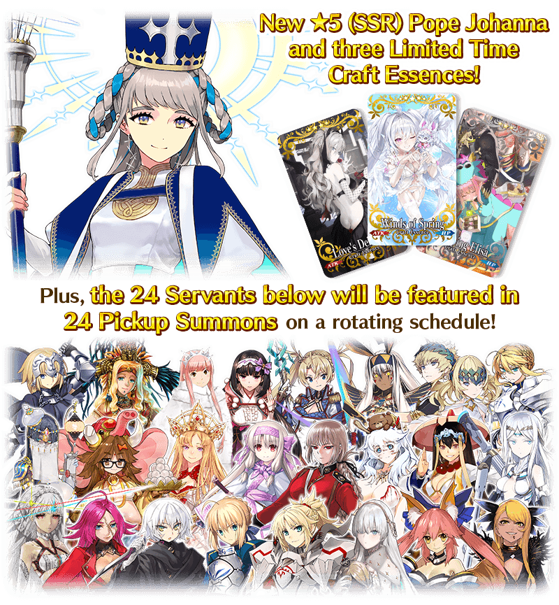 About Featured Servants: * The following Limited Time Servant(s) will only be summonable from the Summon Lineup(s) where they are featured as Pickup Servant(s). In addition, they will not be added to Story Summon after the Pickup Summon period ends. - ★5 (SSR) Pope Johanna * The following Story Summon Servant(s) will be summonable only from Story Summon and the Summon Lineup(s) where they are featured as a Pickup Servant. In the Summon Lineup(s) where they are featured as a Pickup Servant, they will be summonable even if they have not yet been added to Story Summon through story progression. - ★5 (SSR) Altria Pendragon (Lancer) - ★5 (SSR) Queen Medb (Rider) - ★5 (SSR) Quetzalcoatl - ★5 (SSR) Sitonai * In addition to Servants whose gender is listed as "Female", the following Servant(s) will be summonable. - ★5 (SSR) Dioscuri - ★5 (SSR) Enkidu - ★4 (SR) Chevalier d'Eon - ★4 (SR) Astolfo (Rider) * The following Servant(s) will continue to be available through Story Summon after the Pickup Summon period ends. - Story Summon Servants who are featured as a Pickup Servant - Permanent Servants who are featured as a Pickup Servant * The name displayed for Servants whose True Names are hidden will change based on story progression. In some cases, the name displayed for their Noble Phantasm will also change. * The name displayed for ★5 (SSR) Jinako Carigiri (Great Stone Statue God) will change from "★5 (SSR) Great Stone Statue God" to "★5 (SSR) Jinako Carigiri" with Stage 2 Ascension.
