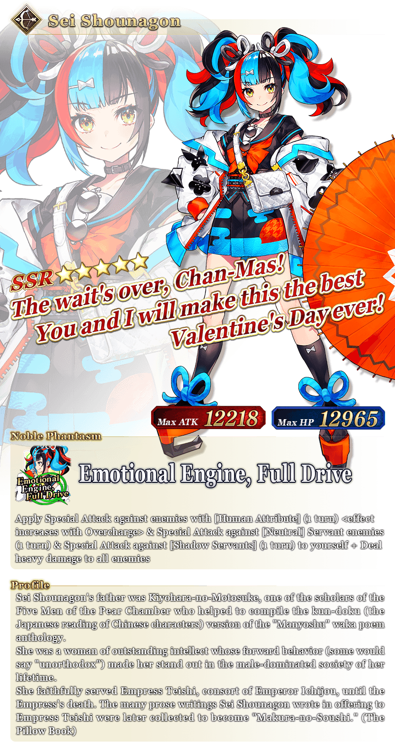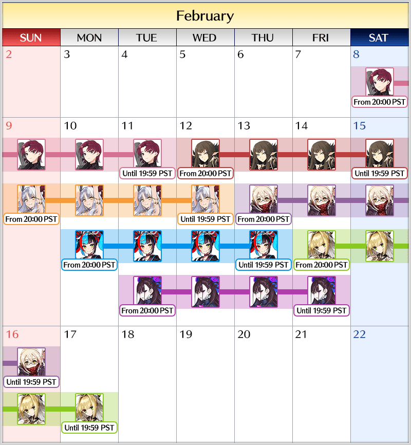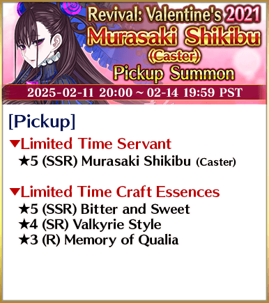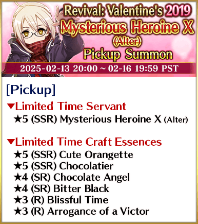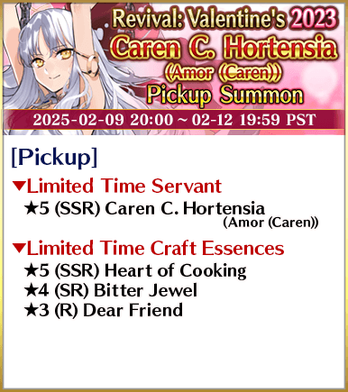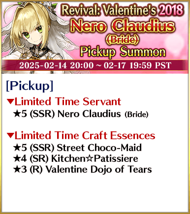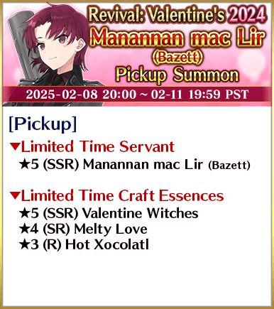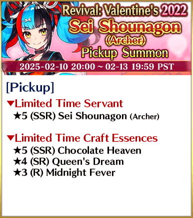 From the Servants related to Valentine's events, seven Limited Time Servants that were available for Pickup in past Valentine's events, as well as 24 Limited Time Craft Essences that were featured in Valentine's events will be available for Pickup in seven Pickup Summons on a daily rotation!