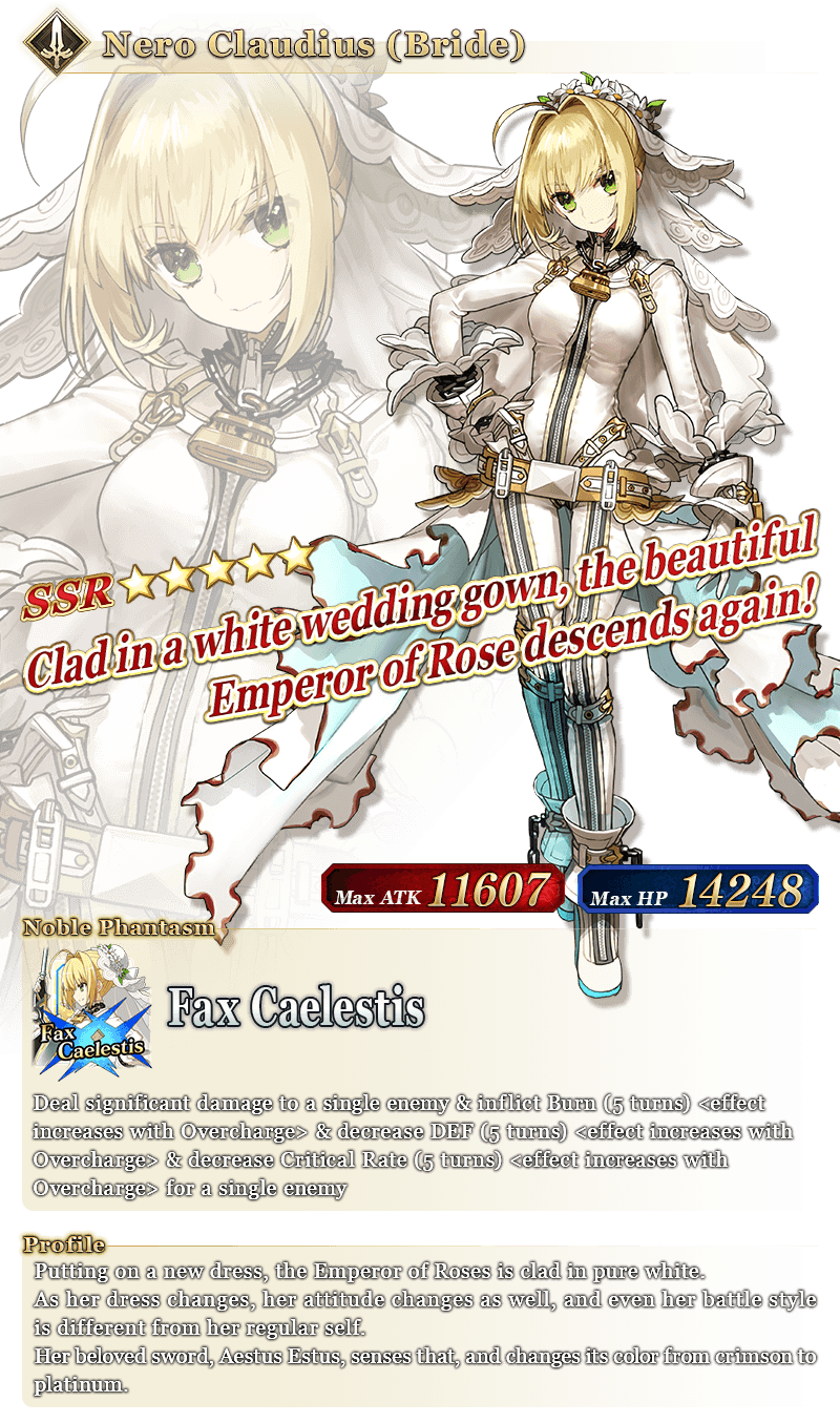 About Featured Servants: * The name displayed on Amor (Caren)'s Saint Graph will change to "Caren C. Hortensia" with Ascension. * The following Limited Time Servant(s) will only be summonable from the Summon Lineup(s) where they are featured as Pickup Servant(s). In addition, they will not be added to Story Summon after the Pickup Summon period ends. - ★5 (SSR) Nero Claudius (Bride) - ★5 (SSR) Sei Shounagon (Archer) - ★5 (SSR) Murasaki Shikibu (Caster) - ★5 (SSR) Semiramis - ★5 (SSR) Mysterious Heroine X (Alter) - ★5 (SSR) Caren C. Hortensia (Amor (Caren)) - ★5 (SSR) Manannan mac Lir (Bazett) * In addition to Servants whose gender is listed as "Female", the following Servant(s) will be summonable. - ★5 (SSR) Dioscuri - ★5 (SSR) Enkidu - ★4 (SR) Chevalier d'Eon - ★4 (SR) Astolfo (Rider) * Servants added to Story Summon through story progression will not be summonable. Please be sure to confirm the lineup before summoning.