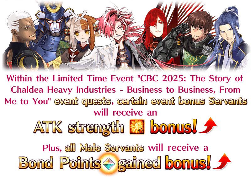For the duration of the Limited Time Event "CBC 2025: The Story of Chaldea Heavy Industries - Business to Business, From Me to You", the Servants listed below will receive an ATK strength bonus within event quests!