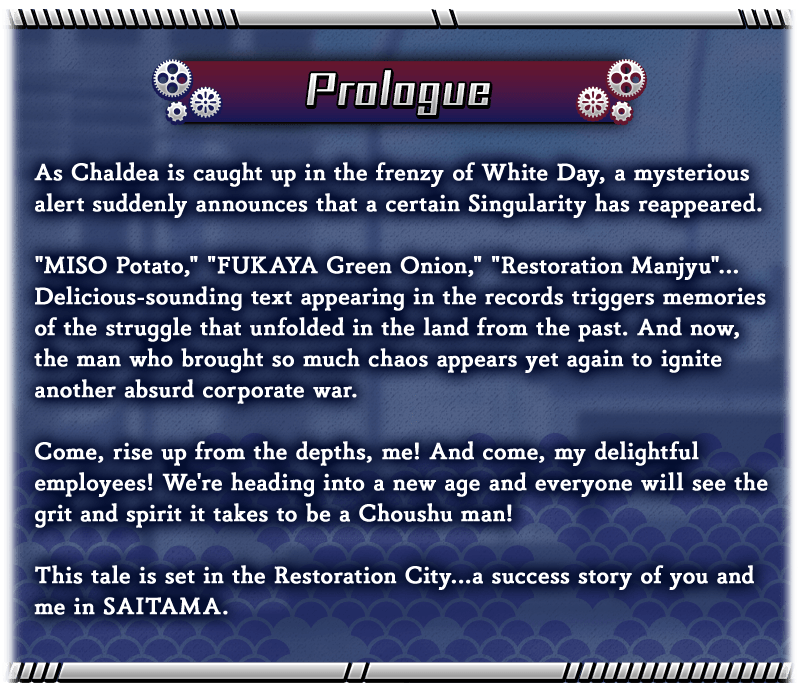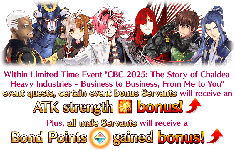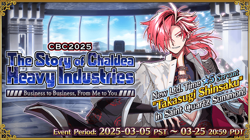 Starting 2025-03-05 00:00 PST (GMT -8), we'll be holding the Limited Time Event "CBC 2025: The Story of Chaldea Heavy Industries - Business to Business, From Me to You"!