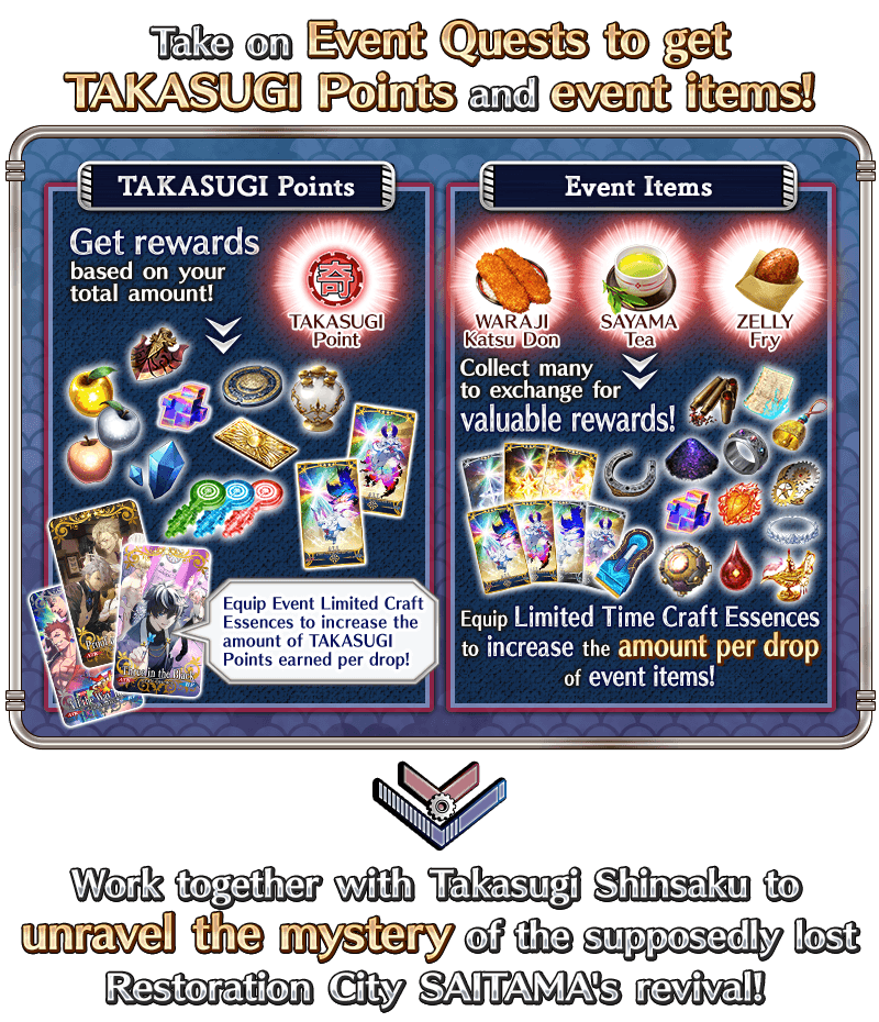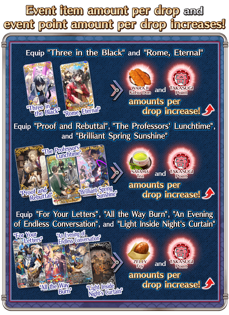 Equip the Limited Time Craft Essences "★5 (SSR) Three in the Black", "★5 (SSR) Rome, Eternal", "★4 (SR) Proof and Rebuttal", "★4 (SR) The Professors' Lunchtime", "★4 (SR) Brilliant Spring Sunshine", "★3 (R) For Your Letters", "★3 (R) All the Way Burn", "★3 (R) An Evening of Endless Conversation", and "★3 (R) Light Inside Night's Curtain", available for Pickup through the Saint Quartz Summon ongoing during this event, to receive a bonus to the amount per drop of event items WARAJI Katsu Don, SAYAMA Tea, and ZELLY Fry, as well as TAKASUGI Points.