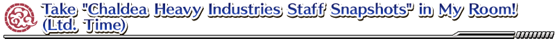 For a limited time, you will be able to take "Chaldea Heavy Industries Staff Snapshots" in My Room, which will allow you to take instant photos of your Servants. In addition, you will be able to display two Servants in My Room at the same time.