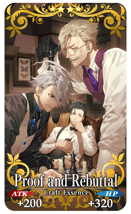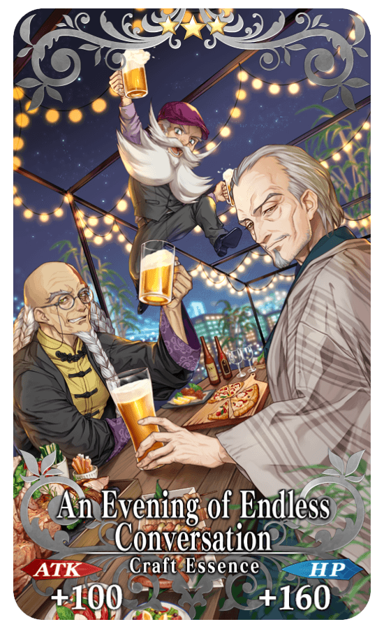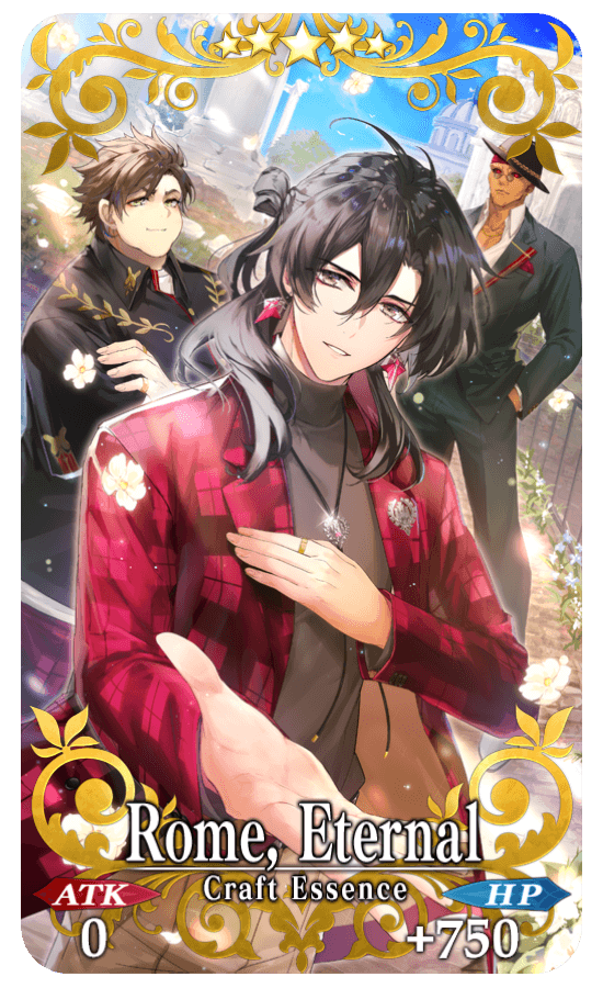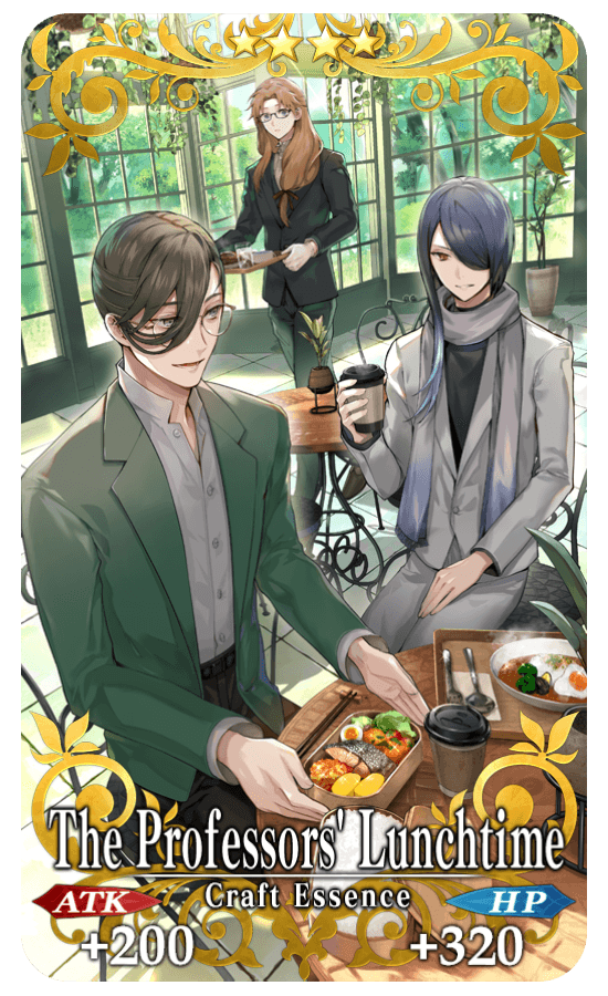 About Featured Craft Essences: * The following are the only Limited Time Craft Essence(s) available from this Pickup Summon. Please note that no other Limited Time Craft Essences will be available. - ★5 (SSR) Three in the Black - ★5 (SSR) Rome, Eternal - ★4 (SR) Proof and Rebuttal - ★4 (SR) The Professors' Lunchtime - ★4 (SR) Brilliant Spring Sunshine - ★3 (R) For Your Letters - ★3 (R) All the Way Burn - ★3 (R) An Evening of Endless Conversation - ★3 (R) Light Inside Night's Curtain * The following Craft Essence(s) will also be available from Friend Point Summon for the duration of the Pickup Summon period. In addition, the Craft Essence(s) will be automatically burned if you have ★3 (R) Craft Essences included in your Automatic Burning settings. Please check your settings before summoning. - ★3 (R) For Your Letters - ★3 (R) All the Way Burn - ★3 (R) An Evening of Endless Conversation - ★3 (R) Light Inside Night's Curtain