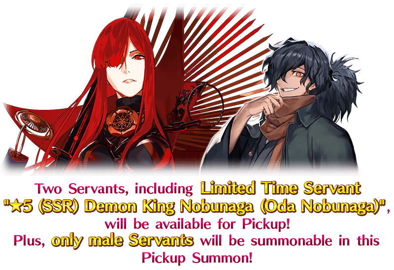 About Featured Servants: * The name displayed for ★5 (SSR) Demon King Nobunaga (Oda Nobunaga) will change from "★5 (SSR) Oda Nobunaga" to "★5 (SSR) Demon King Nobunaga" with Stage 3 Ascension. * The following Servant(s) will not be added to Story Summon after the Pickup Summon period ends. - ★5 (SSR) Demon King Nobunaga (Oda Nobunaga) - ★3 (R) Okada Izo * In addition to Servants whose gender is listed as "Male", the following Servant(s) will be summonable. - ★5 (SSR) Dioscuri - ★5 (SSR) Orion - ★5 (SSR) Enkidu - ★5 (SSR) Demon King Nobunaga (Oda Nobunaga) - ★4 (SR) Chevalier d'Eon - ★4 (SR) Caenis (Lancer) - ★4 (SR) Astolfo (Rider) * The following Story Summon Servant(s), as well as all Story Summon Servants whose gender is listed as "Male", will be summonable even if they have not yet been added to Story Summon through story progression. No other Servants added to Story Summon through story progression will be summonable. - ★4 (SR) Caenis (Lancer) * Please note that the following Servant(s) will not be available through Friend Point Summon. - ★3 (R) Okada Izo