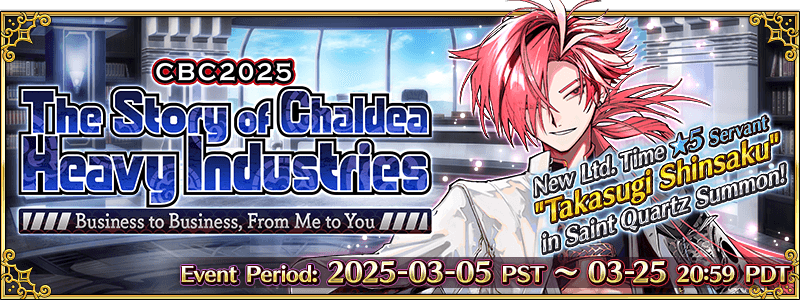 The Limited Time Event "CBC 2025: The Story of Chaldea Heavy Industries - Business to Business, From Me to You" and more will also be ongoing for a limited time!
