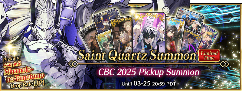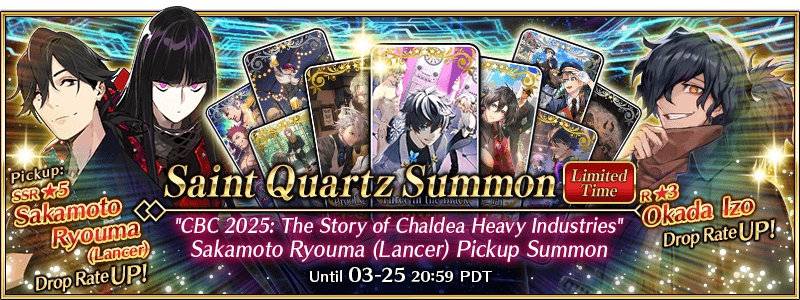 To go along with the Limited Time Event "CBC 2025: The Story of Chaldea Heavy Industries - Business to Business, From Me to You", two Servants, including Limited Time Servant "★5 (SSR) Sakamoto Ryouma (Lancer)", and nine Limited Time Craft Essences will be available for Pickup! These Craft Essences will have fully-voiced scenes that play when they are first summoned!