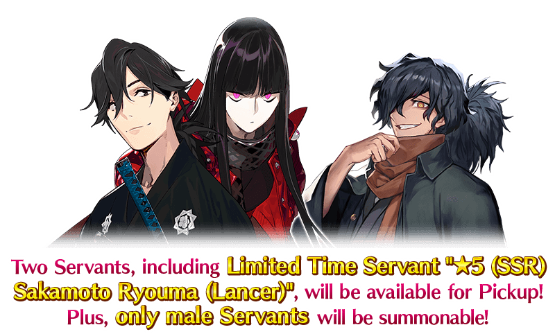 About Featured Servants: * The following Servant(s) will not be added to Story Summon after the Pickup Summon period ends. - ★5 (SSR) Sakamoto Ryouma (Lancer) - ★3 (R) Okada Izo * In addition to Servants whose gender is listed as "Male", the following Servant(s) will be summonable. - ★5 (SSR) Dioscuri - ★5 (SSR) Orion - ★5 (SSR) Enkidu - ★4 (SR) Chevalier d'Eon - ★4 (SR) Caenis (Lancer) - ★4 (SR) Astolfo (Rider) * The following Story Summon Servant(s), as well as all Story Summon Servants whose gender is listed as "Male", will be summonable even if they have not yet been added to Story Summon through story progression. No other Servants added to Story Summon through story progression will be summonable. - ★4 (SR) Caenis (Lancer) * Please note that the following Servant(s) will not be available through Friend Point Summon. - ★3 (R) Okada Izo