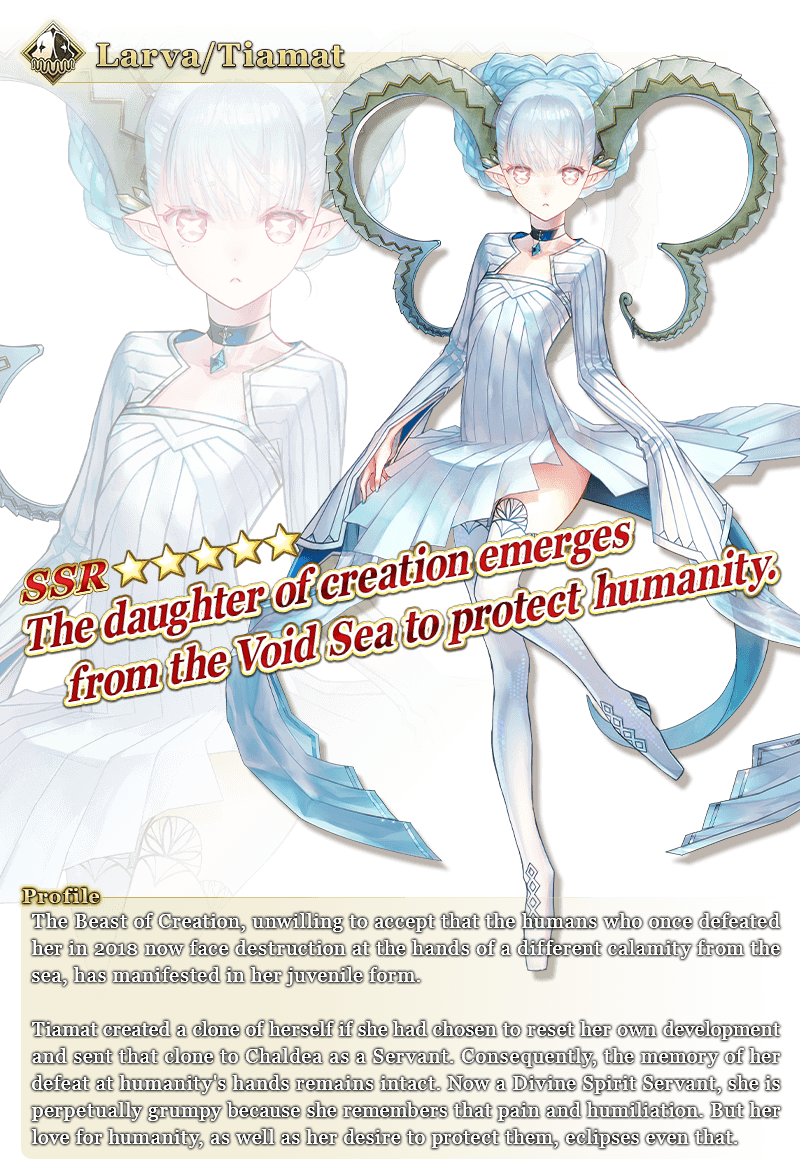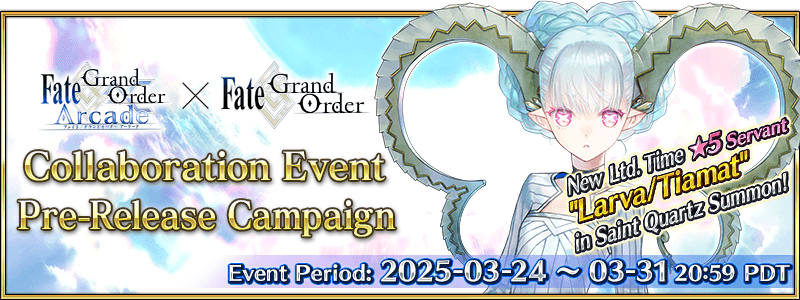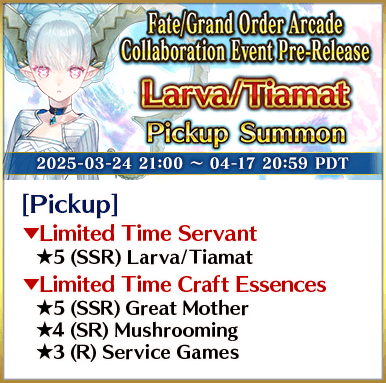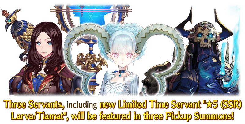 To go along with the "Fate/Grand Order Arcade×Fate/Grand Order Collaboration Event Pre-Release Campaign", three Limited Time Servants, including new Servant "★5 (SSR) Larva/Tiamat", and three Limited Time Craft Essences will be available for Pickup in three Pickup Summons!