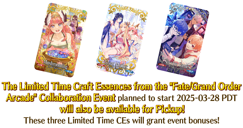 About Featured Craft Essences: * The following Craft Essence(s) will also be available from Friend Point Summon for the duration of the Pickup Summon period. In addition, the Craft Essence(s) will be automatically burned if you have ★3 (R) Craft Essences included in your Automatic Burning settings. Please check your settings before summoning. - ★3 (R) Service Games