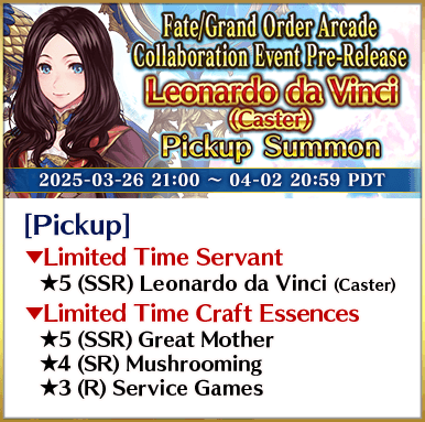 About Featured Servants: * The following Limited Time Servant(s) will only be summonable from the Summon Lineup(s) where they are featured as a Pickup Servant. In addition, they will not be added to Story Summon after the Pickup Summon period ends. - ★5 (SSR) Leonardo da Vinci (Caster) - ★5 (SSR) "First Hassan" - ★5 (SSR) Larva/Tiamat * Servants added to Story Summon through story progression will not be summonable. Please be sure to confirm the lineup before summoning.