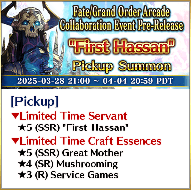Maintenance to prepare for a new Limited Time Event is scheduled for 2025-03-27 21:00 - 03-28 02:00 PDT (GMT -7), which will overlap with the Summon Period of the limited time "Fate/Grand Order Arcade Collaboration Event Pre-Release Pickup Summon". It will not be possible to play the game or summon during maintenance.