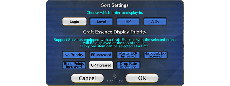 Options to display Servants with certain Craft Essence effects higher in the list when selecting Supports have been added.