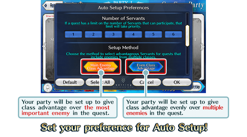 In "Setup Type", you can choose whether to have auto setup prioritize class advantage towards the major enemies in a quest or to have an even distribution of class advantage over all enemies. You can now customize auto setup depending on the quest in question and the Servants you have.