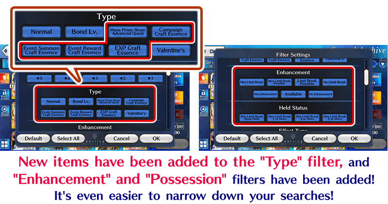 [Items Added to the "Type" Filter] - Mana Prism Exchange and Advanced Quest Craft Essences - Campaign Craft Essences - Event Craft Essences (Summonable) - Event Craft Essences (Rewards) - EXP Craft Essences [New Filters] ■ Enhancement Status - Max Limit Break Performed - Max Limit Break Possible - Limit Break Possible - No Limit Break Performed - Max Enhancement Complete - Enhancement Possible - No Enhancement Performed ■ Held Status - Do Not Have at Max Limit Break - Have # or More Copies at Max Limit Break