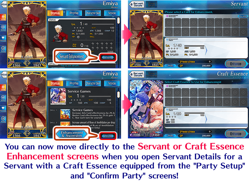 You can now navigate directly to Servant and Craft Essence Enhancement screens for a given Servant and the Craft Essence they have equipped if you open their Servant Details on the "Party Setup" and "Confirm Party" screens.