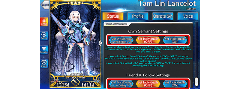 Within the "Random Ascension Level" item on the Servant Details screen, it will now be possible to turn random Ascension level display on or off for an individual Servant, regardless of whether "Display Random Ascension Levels for All Servants" in Game Options is on or off.