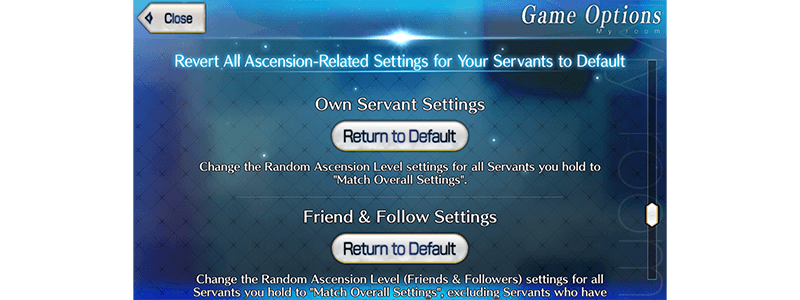 A "Return All Servant Ascension Settings to Default (Held)" function will be added to the Game Options.