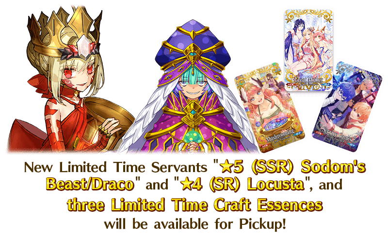 About Featured Servants: * The following Servant(s) will not be added to Story Summon after the Pickup Summon period ends. - ★5 (SSR) Sodom's Beast/Draco - ★4 (SR) Locusta * Servants added to Story Summon through story progression will not be summonable. Please be sure to confirm the lineup before summoning.
