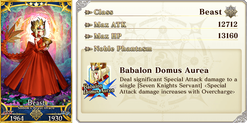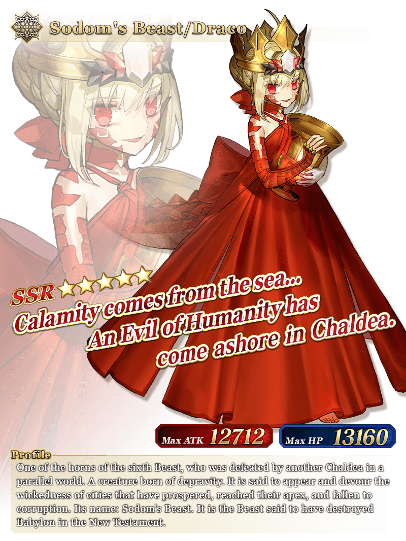 * The game music and animations for ★5 (SSR) Sodom's Beast/Draco's Noble Phantasm at Stage 3 Ascension will change after clearing a certain Main Quest within the Limited Time Fate/Grand Order Arcade×Fate/Grand Order Collaboration Event "Spiral Proof World, Lilim Harlot - A Rose Without Ovation". * After the event period ends at 2025-04-17 21:00 PDT, the game music and animations for her Noble Phantasm at Stage 3 Ascension will change upon clearing her Spirit Origin Release Quest.