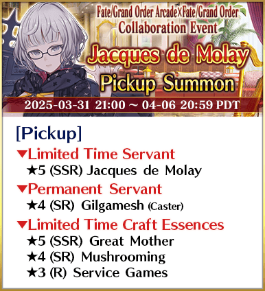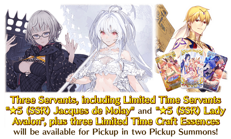 Three Servants related to the Limited Time Fate/Grand Order Arcade×Fate/Grand Order Collaboration Event "Spiral Proof World, Lilim Harlot - A Rose Without Ovation", including Limited Time Servants "★5 (SSR) Jacques de Molay" and "★5 (SSR) Lady Avalon", and three Limited Time Craft Essences will be featured in two Pickup Summons!