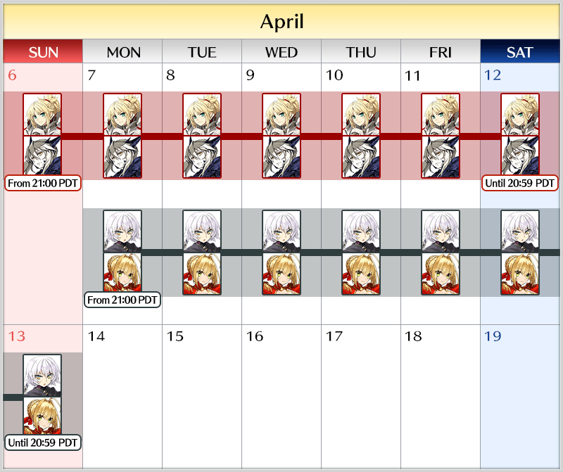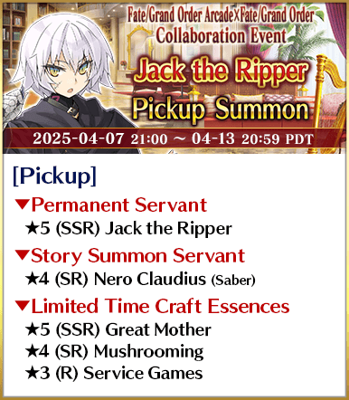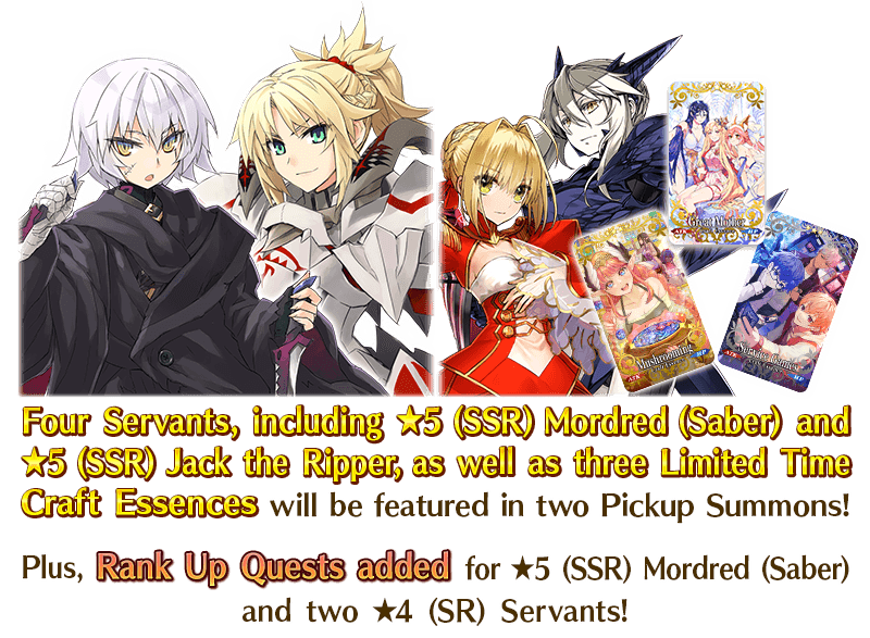 About Featured Servants: * The following Story Summon Servant(s) will be summonable only from Story Summon and the Summon Lineup(s) where they are featured as a Pickup Servant. In the Summon Lineup(s) where they are featured as a Pickup Servant, they will be summonable even if they have not yet been added to Story Summon through story progression. No other Servants added to Story Summon through story progression will be summonable. - ★4 (SR) Nero Claudius (Saber) - ★4 (SR) Altria Pendragon (Alter) (Lancer) * The following Servant(s) will continue to be available through Story Summon after the Pickup Summon period ends. - ★5 (SSR) Mordred (Saber) - ★5 (SSR) Jack the Ripper - ★4 (SR) Nero Claudius (Saber) - ★4 (SR) Altria Pendragon (Alter) (Lancer)