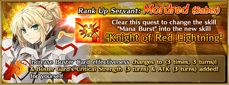 Servant Rank Up Quests to strengthen ★5 (SSR) Mordred (Saber), ★4 (SR) Nero Claudius (Saber), and ★4 (SR) Altria Pendragon (Alter) (Lancer) will be permanently added to Chaldea Gate.