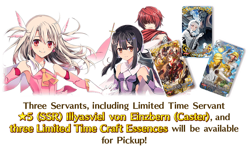 From the Servants related to the Limited Time Event "Illya's Karakuri Castle - Kashin Koji's Modest Ambition", three Servants, including Limited Time Servant "★5 (SSR) Illyasviel von Einzbern (Caster)", and three Limited Time Craft Essences will be available for Pickup!