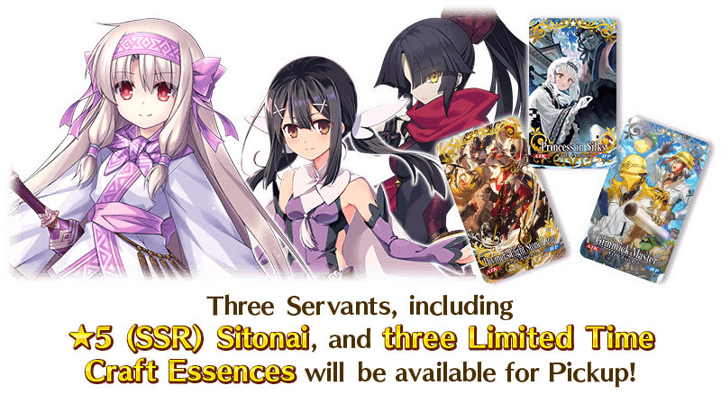Three Servants related to the Limited Time Event "Illya's Karakuri Castle - Kashin Koji's Modest Ambition", including ★5 (SSR) Sitonai, and three Limited Time Craft Essences will be featured in this Pickup Summon!