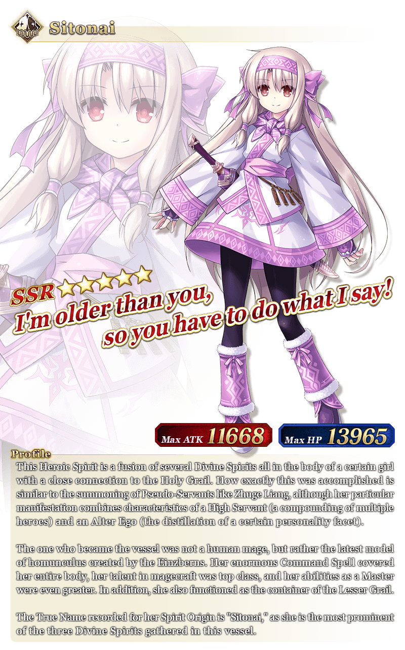 About Featured Servants: * The following Servant(s) will not be summonable from this Summon. - ★5 (SSR) Kashin Koji * The following Servant(s) will be summonable, even if they have not yet been added to Story Summon through story progression. No other Servants added to Story Summon through story progression will be summonable. In addition, the following Servant(s) will continue to be available through Story Summon after the Pickup Summon period ends. - ★5 (SSR) Sitonai - ★4 (SR) Katou "Black Kite" Danzo * The following Servant(s) will not be added to Story Summon after the Pickup Summon period ends. - ★4 (SR) Miyu Edelfelt