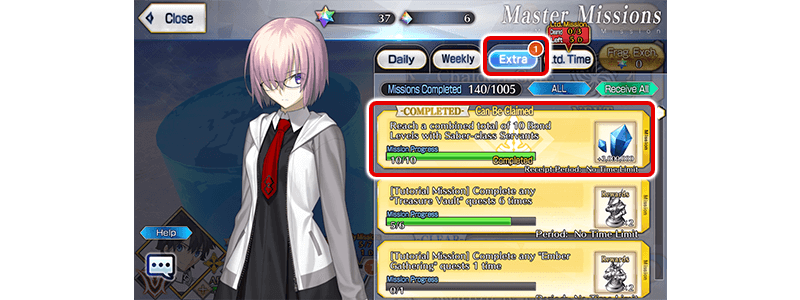 * Missions for Extra classes will be added for two groups: "Ruler, Avenger, Moon Cancer, and Shielder" and "Alter Ego, Foreigner, Pretender, and Beast". The totals needed for completion and rewards for Extra Class missions will differ from non-Extra Class missions.