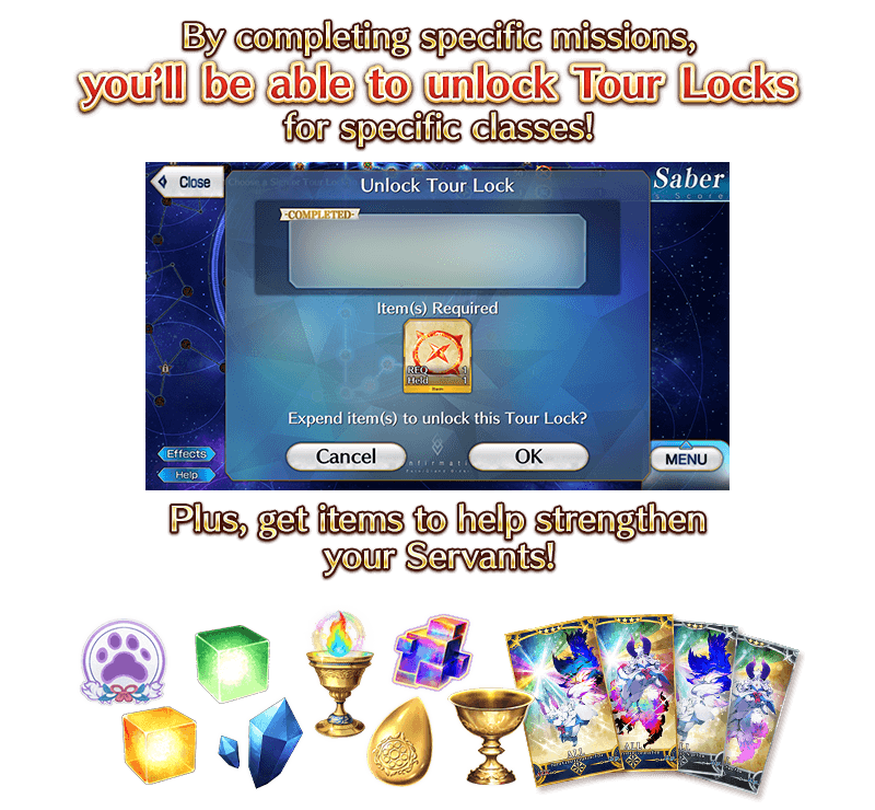 By clearing these missions, you'll be able to get items useful in strengthening your Servants, as well as fulfill requirements to unlock Tour Locks found in Class Score!