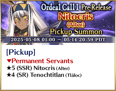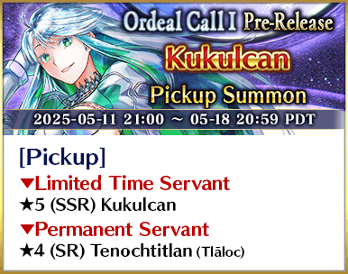About Featured Servants: * The name displayed for ★4 (SR) Tenochtitlan (Tlāloc) will change from "Tlāloc" to "Tenochtitlan" with Stage 3 Ascension after clearing a certain Main Quest within Part 2 Chapter 7 "Lostbelt No.7: Golden Sea of Trees, Nahui Mictlān - Those Who Rule the Planet". * The following Limited Time Servant(s) will only be summonable from the Summon Lineup(s) where they are featured as a Pickup Servant. In addition, they will not be added to Story Summon after the Pickup Summon period ends. - ★5 (SSR) Kukulcan * The following Servant(s) will continue to be available through Story Summon after the Pickup Summon period ends. - ★5 (SSR) Nitocris (Alter) - ★4 (SR) Tenochtitlan (Tlāloc) * Servants added to Story Summon through story progression will not be summonable. Please be sure to confirm the lineup before summoning.