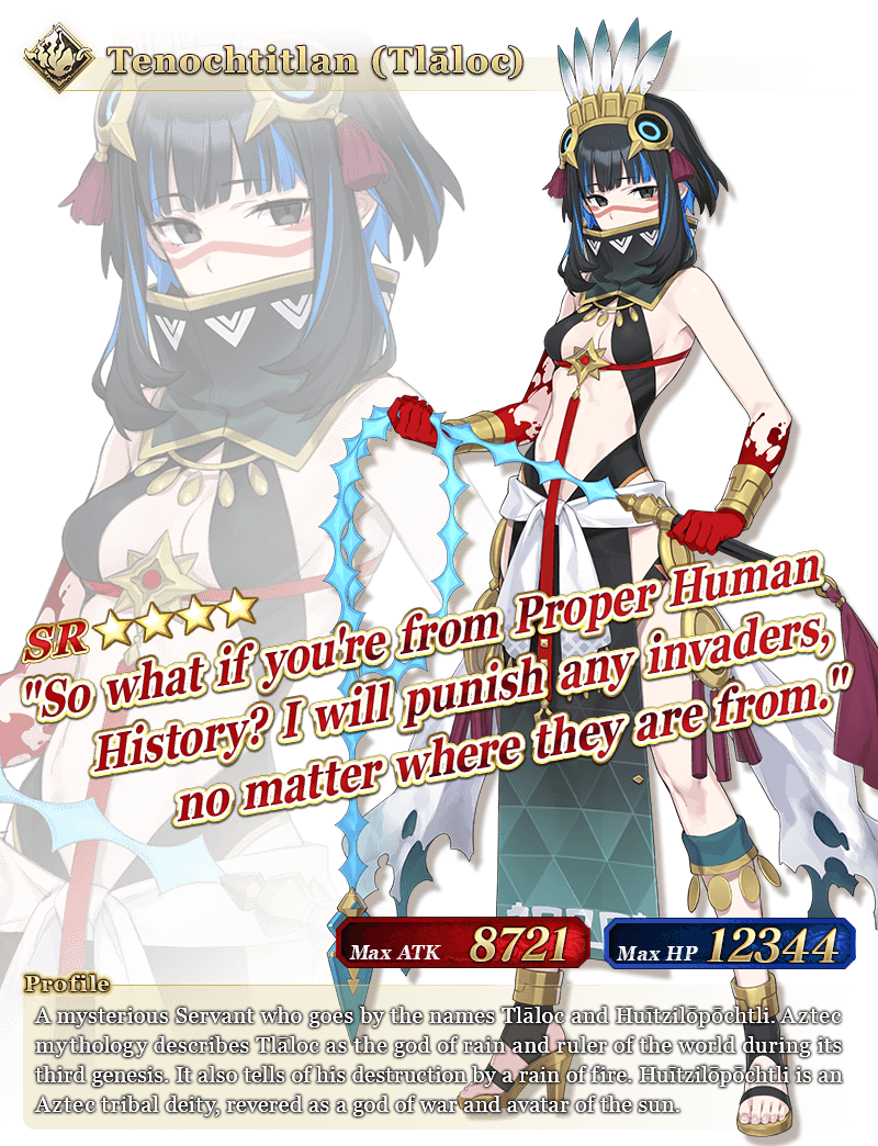 * The name displayed for ★4 (SR) Tenochtitlan (Tlāloc) will change from "Tlāloc" to "Tenochtitlan" with Stage 3 Ascension after clearing a certain Main Quest within Part 2 Chapter 7 "Lostbelt No.7: Golden Sea of Trees, Nahui Mictlān - Those Who Rule the Planet".